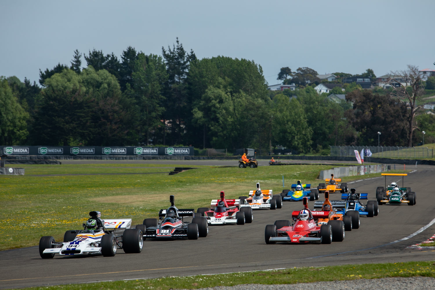 Today’s two races provided a similar spectacle to Saturday’s season-opener with Collins rocketing away from pole position, Grant Martin (Talon MR1A) tucking in behind and David Banks (Talon MR1), Aaron Burson (McRae GM1), Brett Willis (Lola T330), Glenn Richards (Lola T400) and the first of the locals, Kevin Ingram (Lola T332) constituting a multi-colour/multi-car battle pack for positions three-through seven.