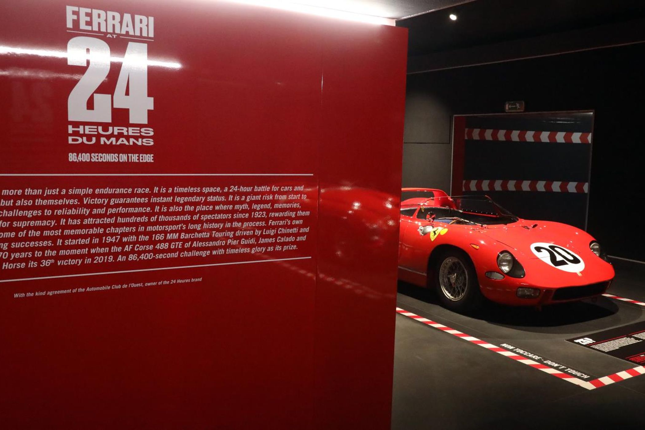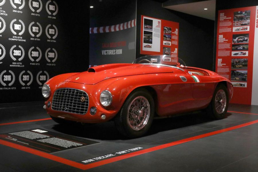 The exhibition opens with the 166 MM Barchetta Touring. With a similar car, Lord Selsdon and Luigi Chinetti triumphed on 26 June 1949, on Ferrari's debut at Le Mans. The British aristocrat and the Milanese driver transplanted to America faced a large number of British and French professionals whose cars had twice the engine capacity of the Ferrari. Nevertheless, they won with an average speed of 132.946 kilometres per hour. Chinetti went down in history by driving for over 23 hours, handing the wheel to Lord Selsdon for just 30 minutes.