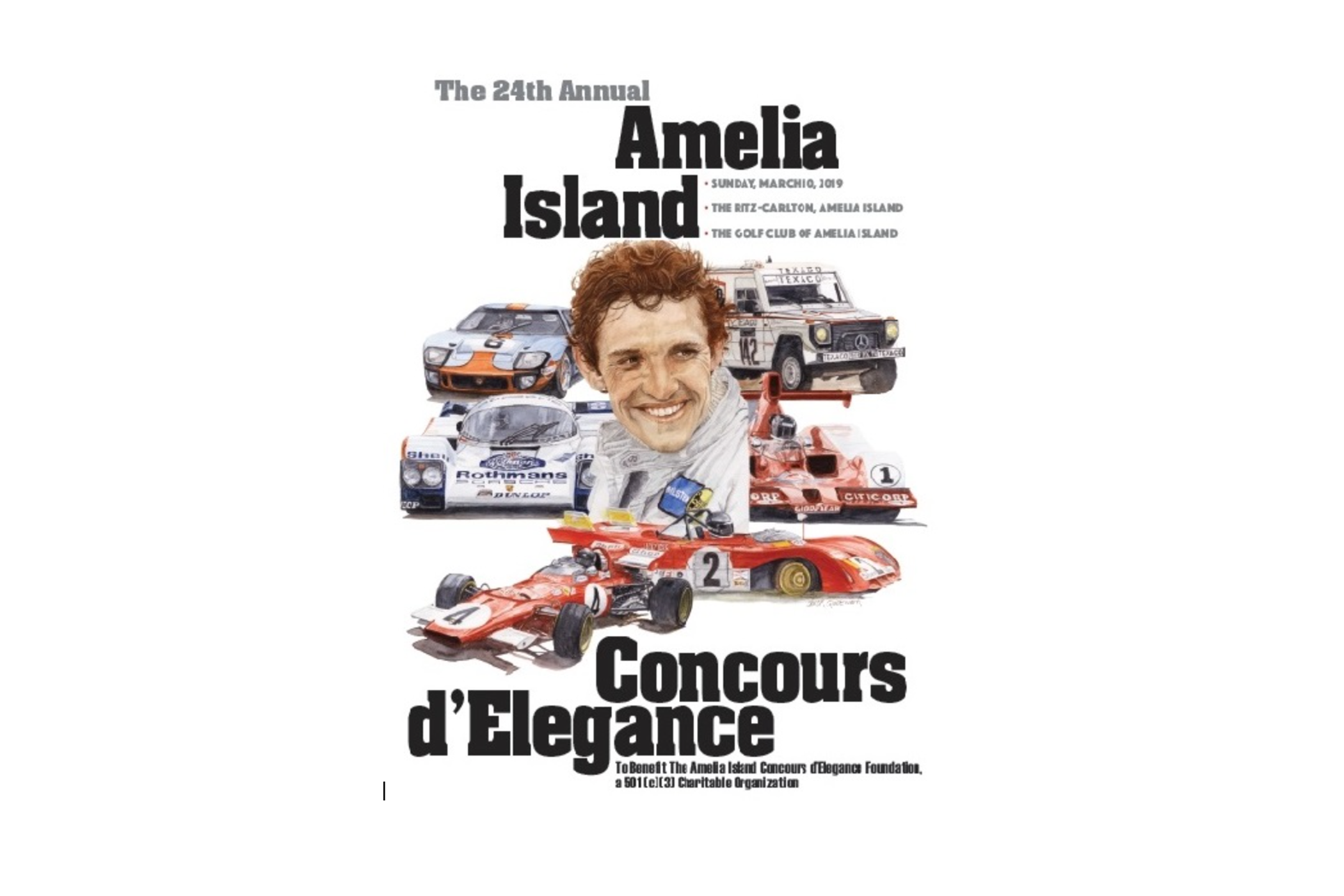 The 24th Amelia Island Concours d’Elegance poster, painted by renowned automotive artist Chuck Queener, features a portrait of Jacky Ickx captured during the prime of his racing career. The surrounding vehicles represent key victories for the champion. Starting at one o’clock and moving clockwise, the artwork features the 1983 Mercedes 280 GE that was built to run the Paris–Dakar Rally. Along with co-driver Claude Brasseur, the Mercedes ran the brutal 6,200 mile off-road race between Paris, France and Dakar, Senegal on Africa’s westernmost tip.