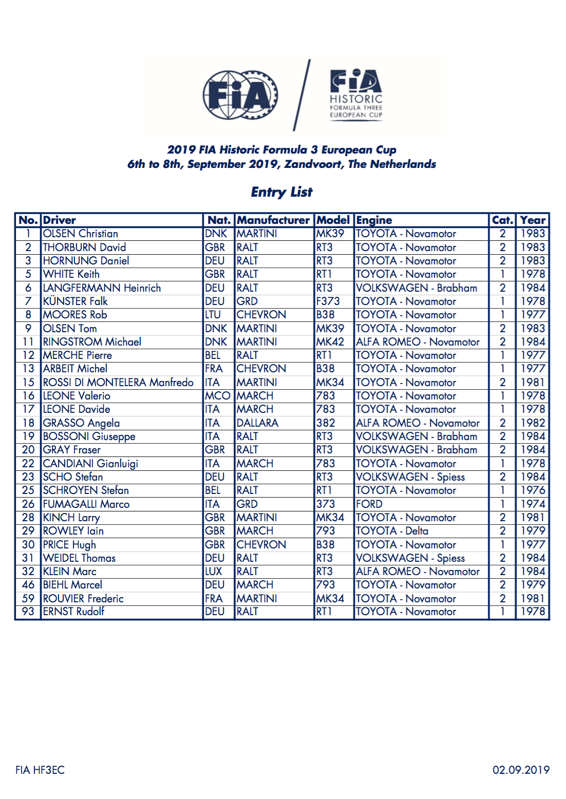 The entry is split into two categories. Category 1 is for cars of the 1971-1978 period and will feature 12 cars, while Category 2 will see 17 entries for the more recent 1979-1984 racers. F3 manufacturers Ralt, March, Martini, GRD, Chevron and Dallara are all represented, with Ralt the most numerous, forming just over 40% of the grid.