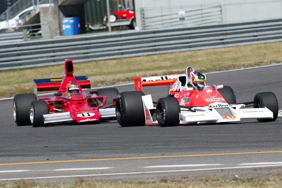 True to form Lyons dominated the Historic Formula 1 class races at the meeting, first in the Hesketh, then today in the McLaren M26 his father Frank usually drives after the Hesketh was side-lined with a leaking water pump.