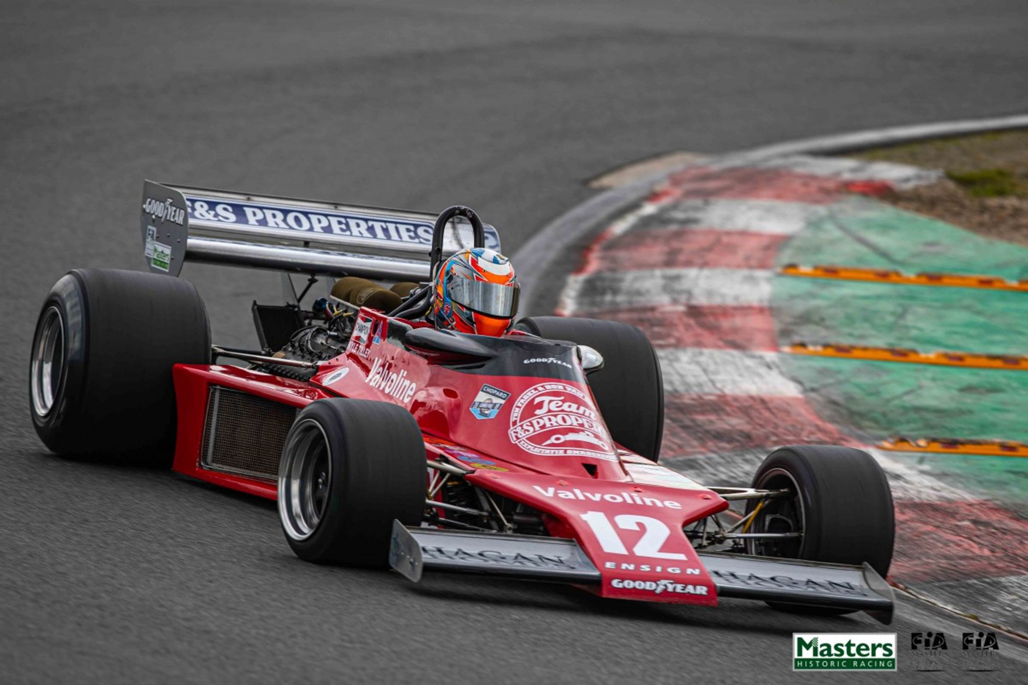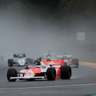 After championship leader Matteo Ferrer’s early exit from the event, crashing his Ligier JS11/15 on oil dropped by the blown engine in Andrew Haddon’s Hesketh 308C, and late entry Michael Lyons also going off in qualifying in his McLaren M26, victory in both FIA Masters Historic Formula One races went to pre-78 cars, Kyle Tilley and Henry Fletcher splitting the wins, each in wet conditions. Tilley’s Ensign N177 won from the front on Saturday while Fletcher made up for a collapsed suspension on Saturday by storming to the front on Sunday in his March 761.