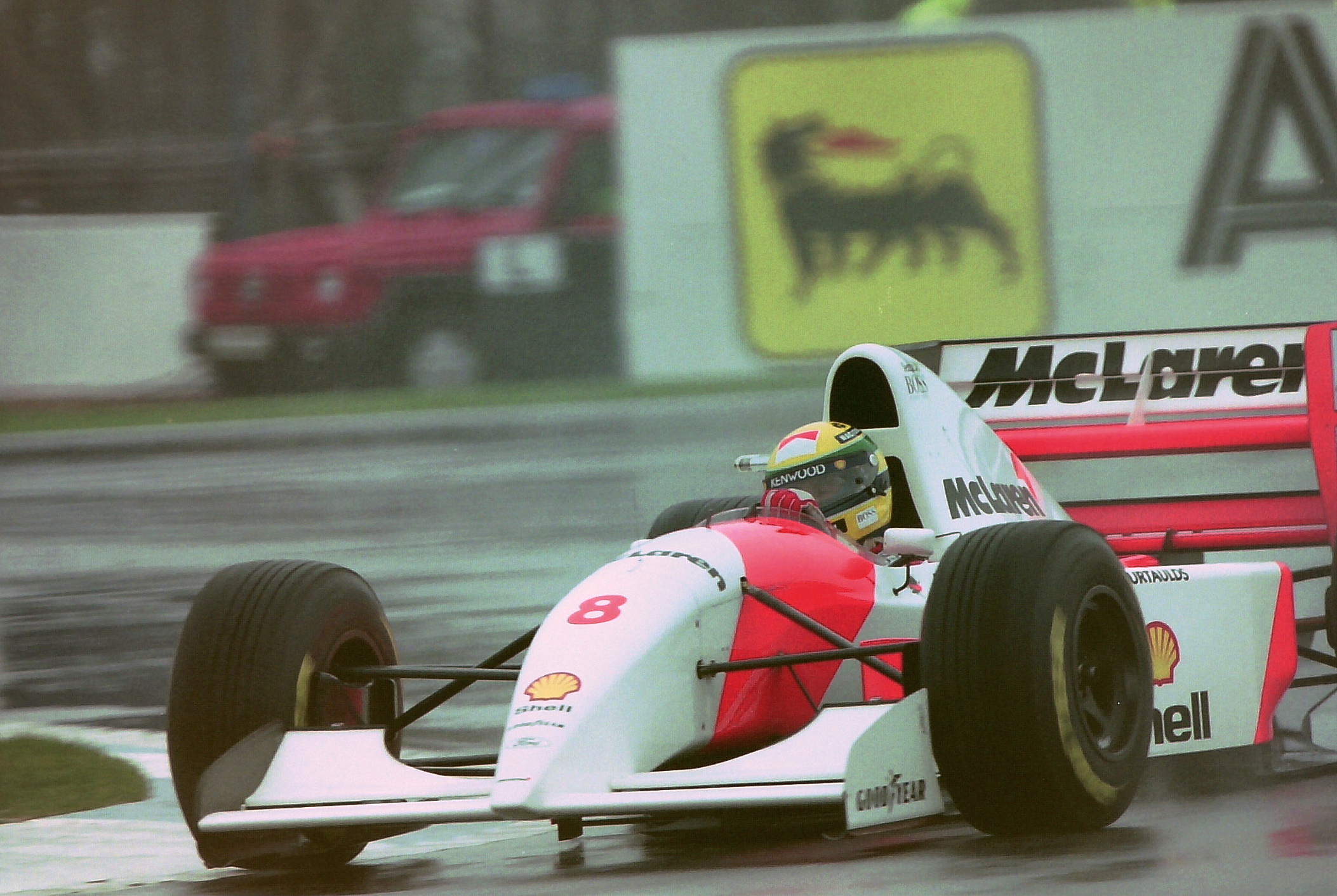 In a wet race Senna had forced his way through to second and was closing on Alain Prost’s McLaren, the Frenchman struggling to get heat into his brakes in the conditions. With Prost gesticulating to race officials every lap about the conditions, the race was halted after 31-laps and the result declared, a very controversial result.
