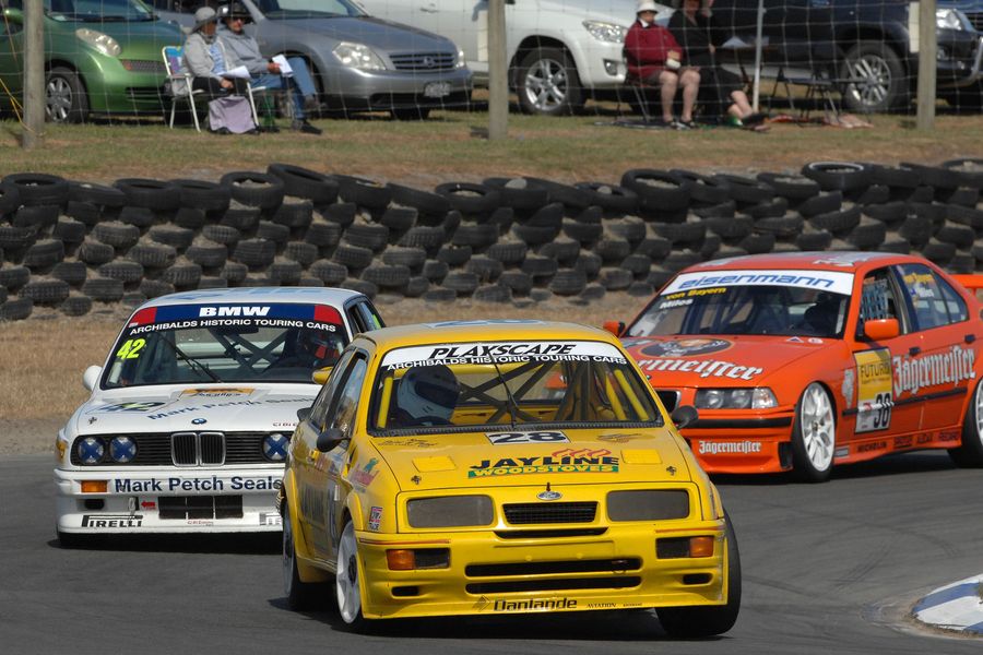 Each era had its iconic cars. Group A, for instance, is represented by the E30 model BMW M3 driven by Arron Black from Mosgiel., the distinctive yellow ex Kevin Waldock Australian Touring Car Championship Ford Sierra RS500 Cosworth of keen Motueka classic touring car owner and driver Brett Stevens, and the replica Nissan Skyline GT-R AWD of Amberley ace Stu Rogers.