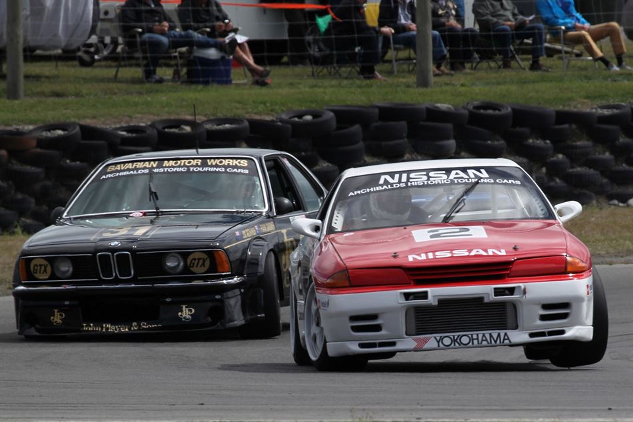 Expat Kiwi legend Jim Richards (BMW 635i) and local car builder/driver Stu Rogers (Nissan Skyline GTR) shared race wins on an entertaining first day for the Archibalds Historic Touring Car class at the annual Skope Classic motor racing meeting in Christchurch today.