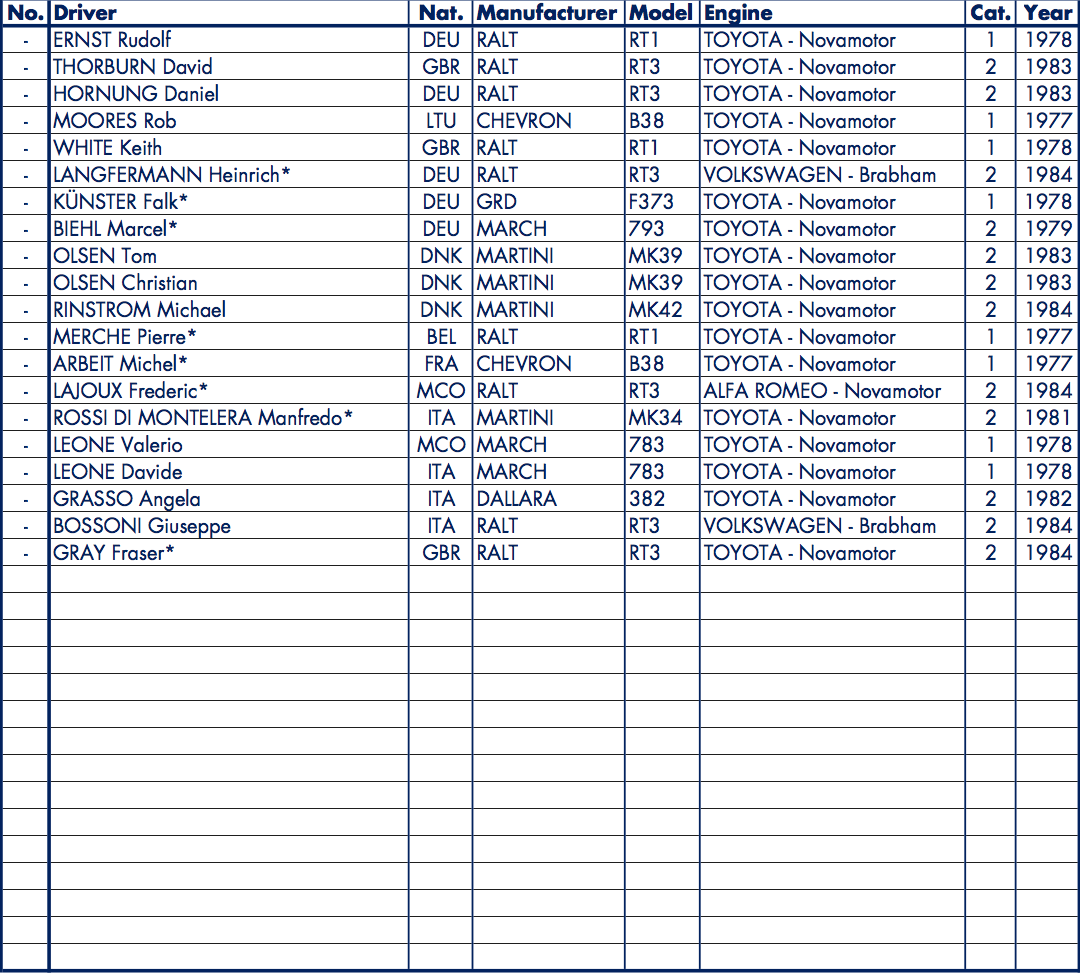Italian Angela Grasso will race the only Dallara entered for the so far, her 1982 Toyota-Novamotor powered Dallara 382 running alongside the March, Martini and Ralt Category 2 entries.