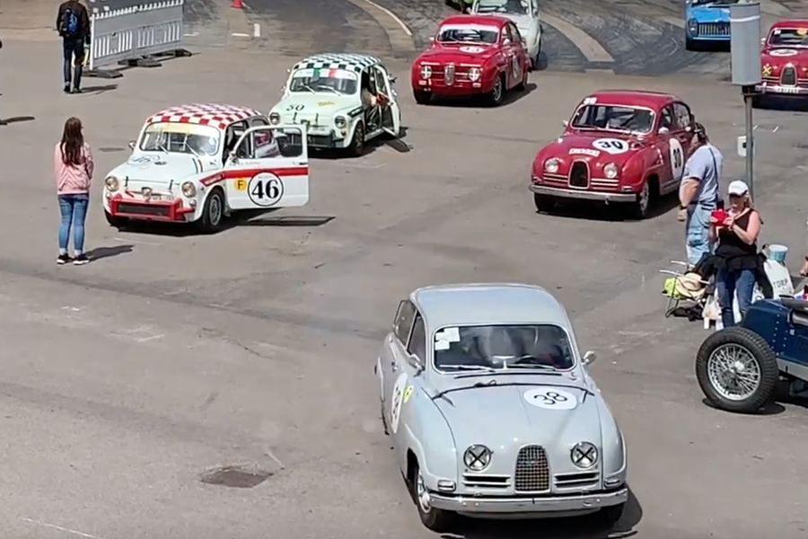 Interestingly, the outside line of the two-by-two grid, led by Torbjörn Andersson's Riviera Racing Mini #52, is released from the assembly area first, allowing marshals to move across to the pit side of the track, where the #46 Fiat Abarth of Per Skårner will take up pole position.