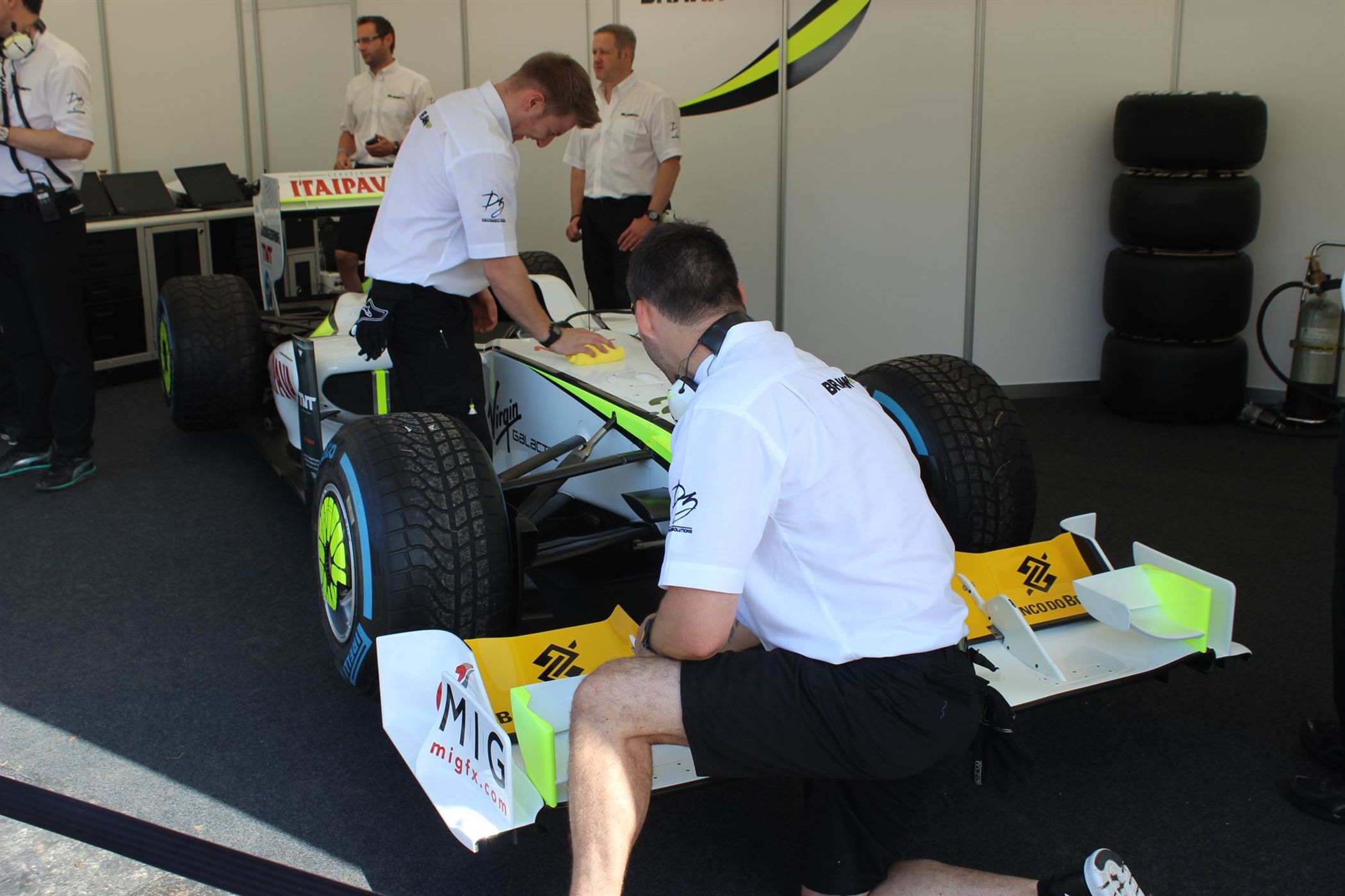 “Then we had to start working our way through the car. We had to crack test all the wishbones as you don’t know if anyone has ever tried to lift it up incorrectly and carbon fibre is only strong in one plane. We had to find some wheels as it was only on the one set, we managed to find – or borrow – the wheels from the other Brawn that is at Mercedes, and is now up on stands, so we could have one set on wets and one on slicks.